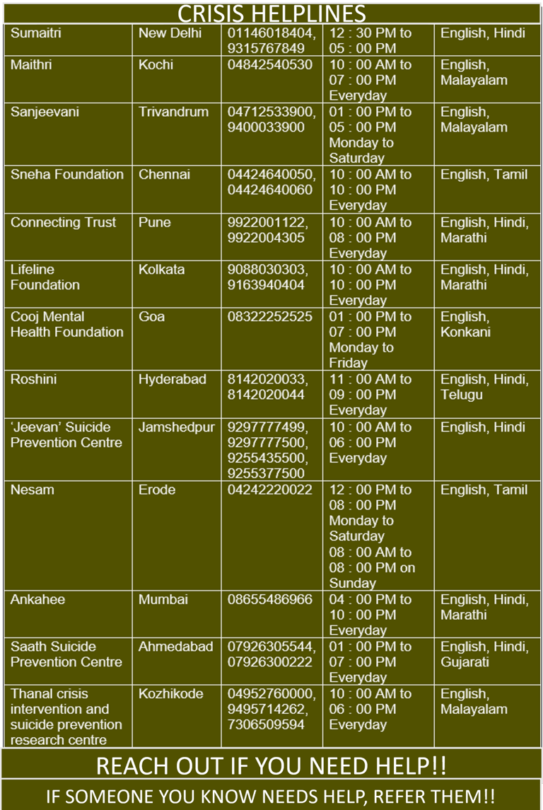 If you are feeling suicidal, please call the crisis helpline numbers given on the website